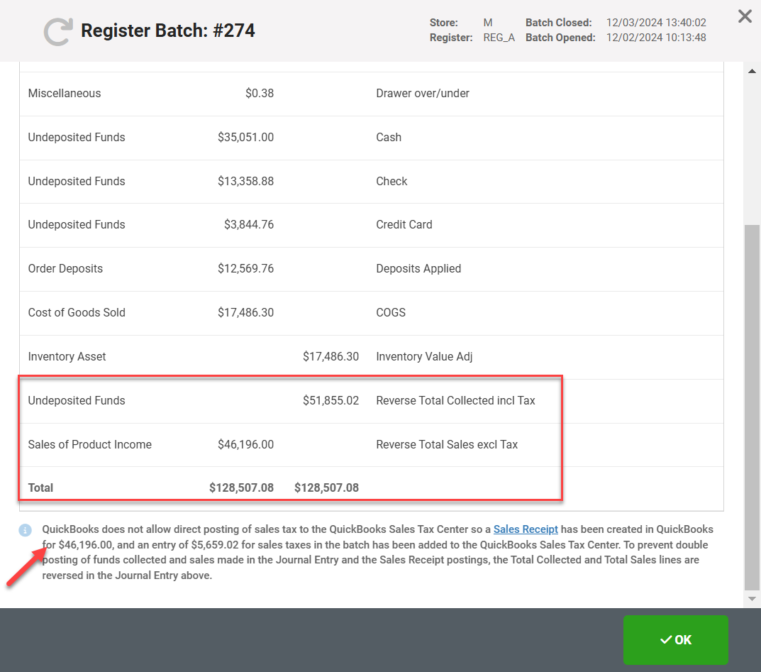 QuickBooks does not allow direct posting of sales tax to the QuickBooks Sales Tax Center so a Sales Receipt has been created in QuickBooks for $46,196.00, and an entry of $5,659.02 for sales taxes in the batch has been added to the QuickBooks Sales Tax Center. To prevent double posting of funds collected and sales made in the Journal Entry and the Sales Receipt postings, the Total Collected and Total Sales lines are reversed in the Journal Entry below.