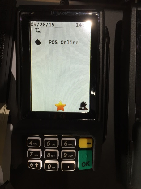 Once you have done this, proceed to plug in the DC power cable into either an outlet or you can also remove the power adapter to plug it into a USB port on your machine. If both the power and Ethernet cable (or wireless connection) were set up correctly, you should get a "POS Online" message on the screen of the terminal as shown below.