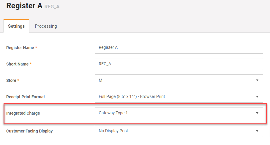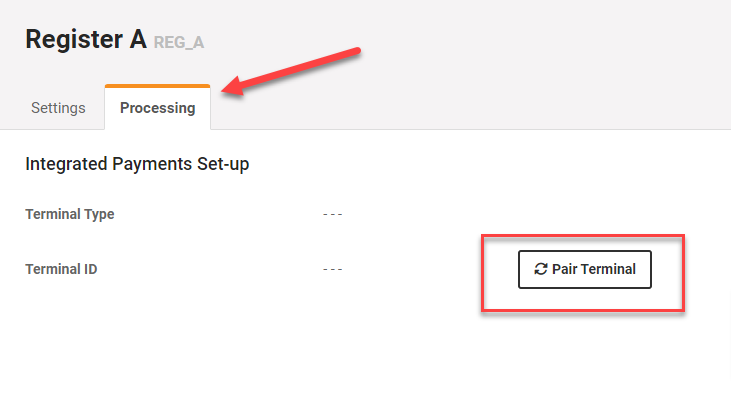 Then navigate to the "Processing" tab found at the top of the register settings tab and press the 'Pair Terminal' button to the right, as shown below.