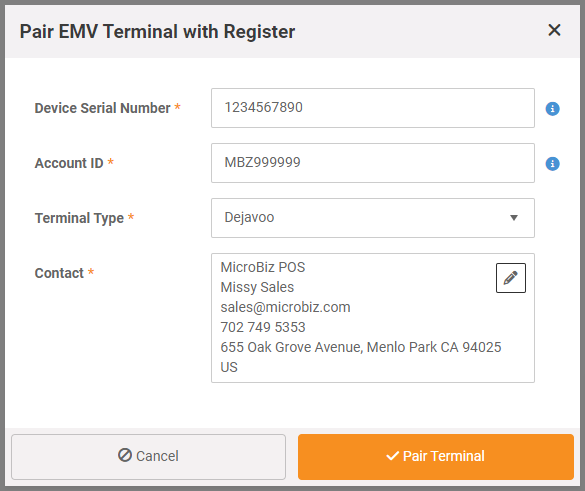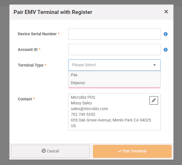 - Contact - Enter the Company information from your MicroBiz store settings. This can be accessed in MicroBiz at Settings > Company. This info is used by MicroBiz to assign your company to your terminal device.