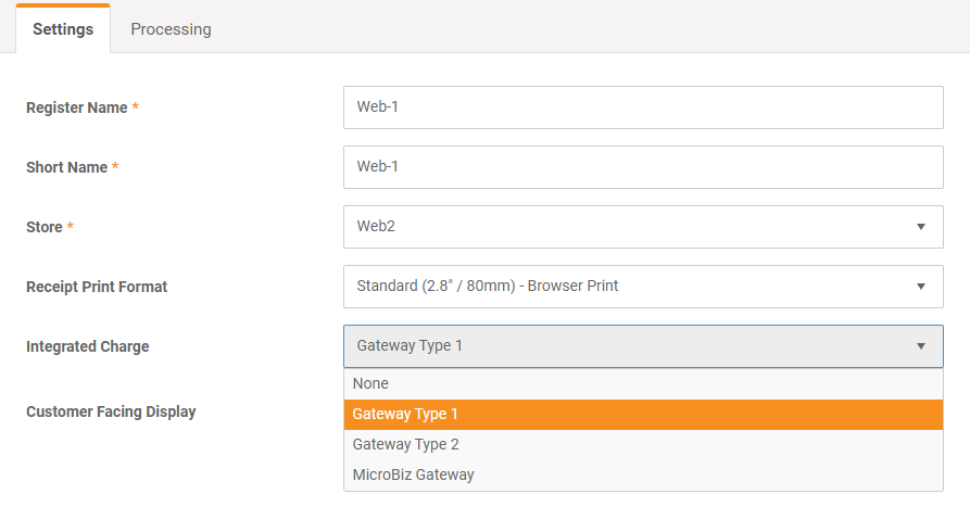 Step Two: Select Gateway Type From MicroBiz Register Settings Page