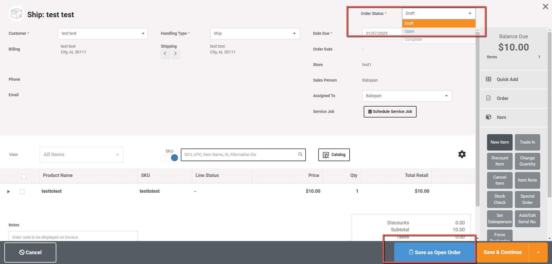Step Two - Mark Order as 'Open' to commit item to the customer order