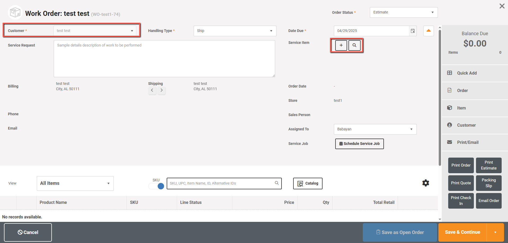 4. Add a product or service to the order (required). This can be an estimated charge, or you can create a zero value service to the work order