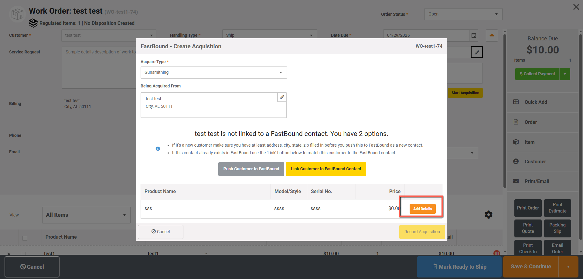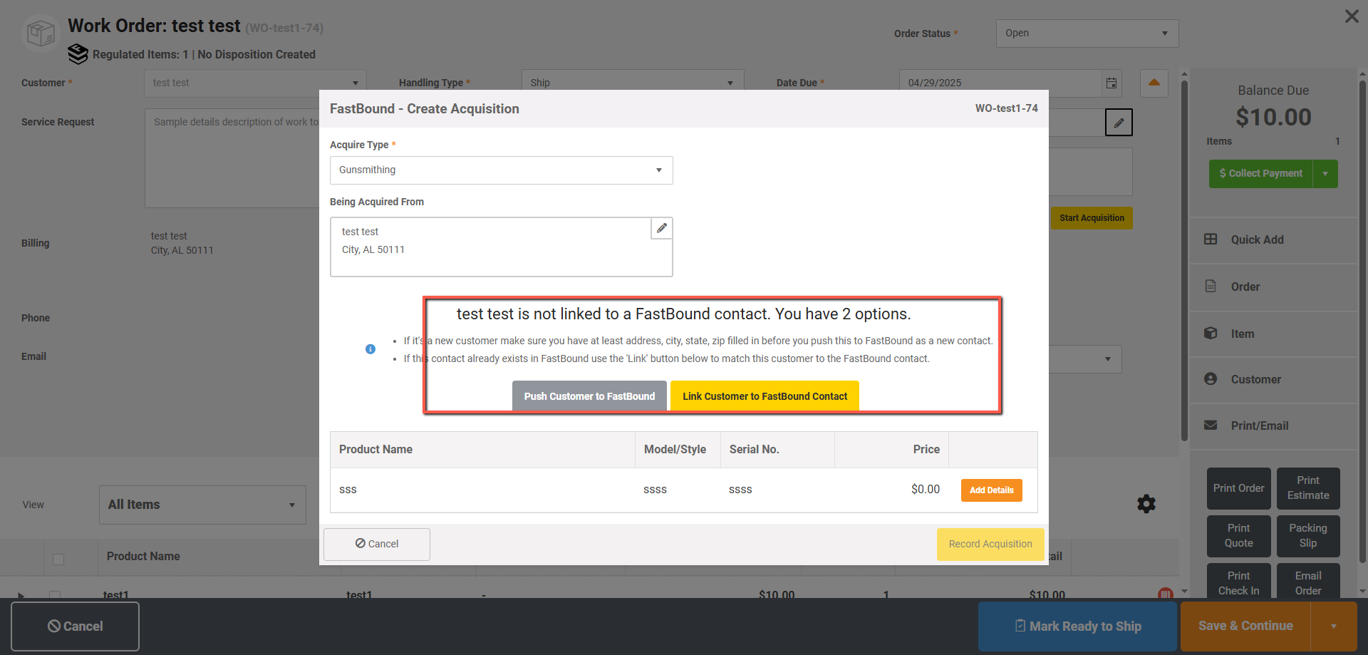 The integration with FastBound allows you to create an acquisition and disposition of a customer-owned firearm during a gunsmithing work order.