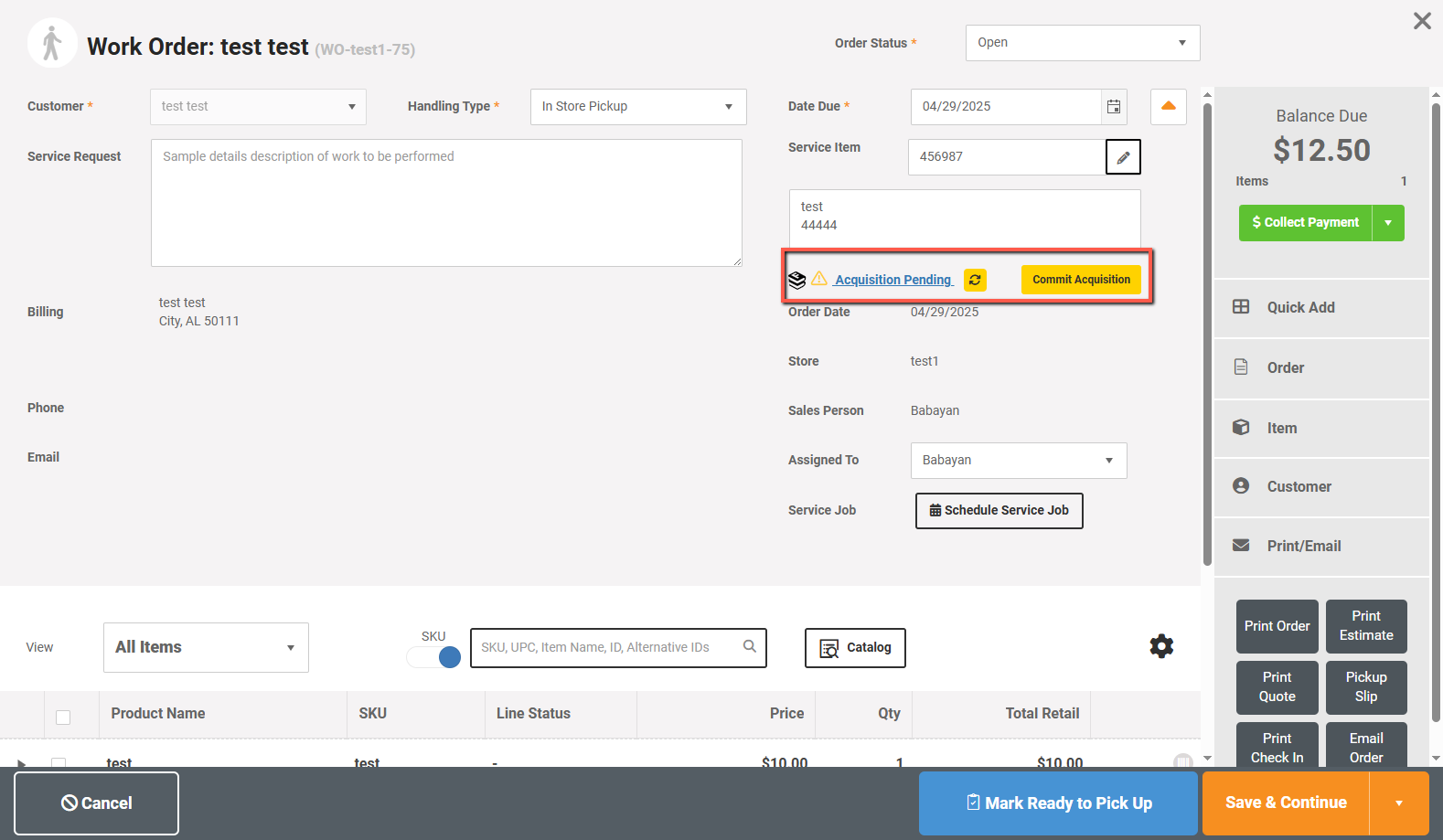If you do not see the 'Start Acquisition' button, please check that you have 1) added a service item, 2) added a product or service to the work order (even if its a zero value service), and 3) saved the work order as an Open Order.
