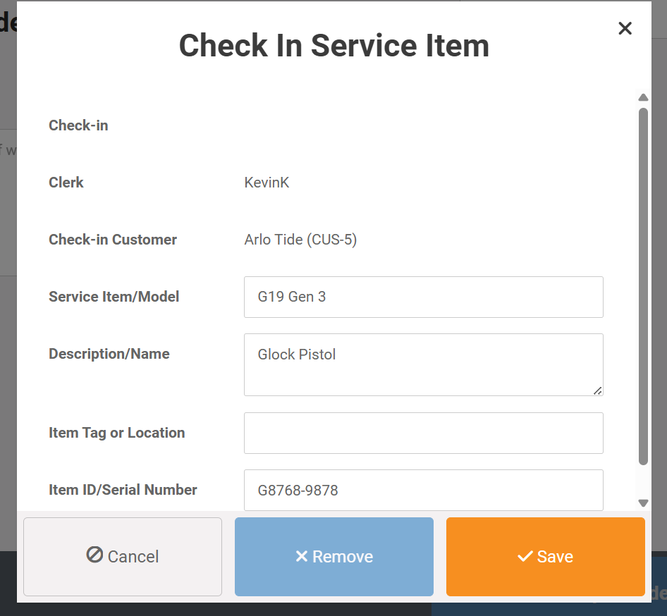 3. Check in a customer-own firearm using the Service Item module. You can either create a new firearm, or search and attach firearms previously checked in by the customer.