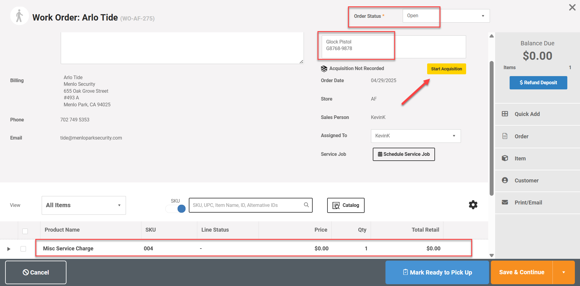 Once a work order with a service Item and product/servce is saved as a Open Order, you will see a yellow "Start Acquisition" button.